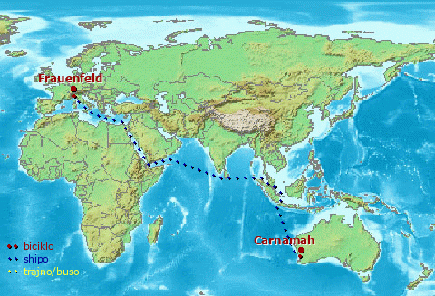 Mia vojaghe reen al SvislandoEstas memkomprenebla ke ankau por reveni Svislanden mi vojaghos per tero kaj akvo, ech se la proporcio de tiuj du partoj estos iel alie.